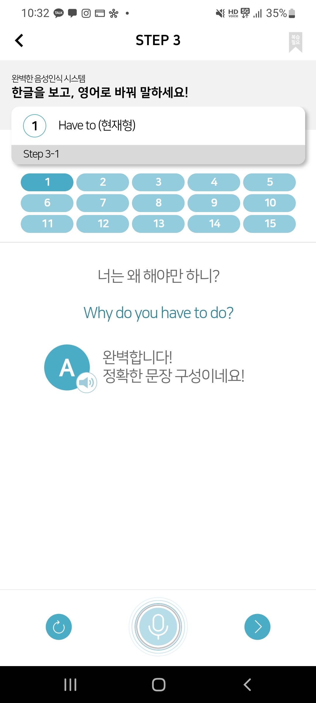 트레이닝 1 ,2 하고 영어로 바꿔서 말할 수 있게 한글을 보고 영어를 말하면 AI가 영어 정답을 판단해주는 부분이 있다.