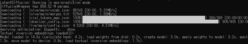 처음으로 sd를 실행할 때는 많은 파일들을 다운 받아서 설치합니다. 정말 많은 파일을 다운 받아 설치하기 때문에 시간이 걸립니다.