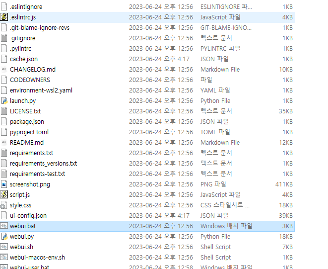 c 드라이브에 있는 유저 폴더로 가셔서 본인의 어카운트 폴더로 이동하셔도 됩니다 깃허브에서 sd를 다 받아왔다면 이곳에서 이렇게 SD 폴더가 만들어져 있어야 합니다 이제 sd를 실행해 보겠습니다 여기에 있는 webui.bat으로 설치를 하자.